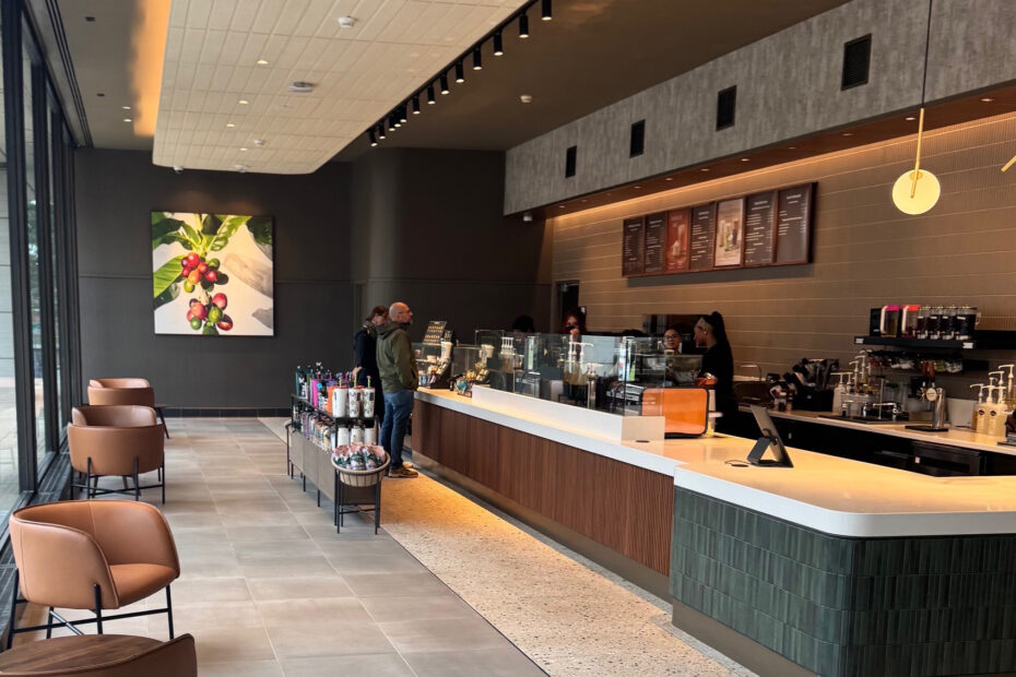 The new 3,000 square-foot Starbucks offers a modern, loft-inspired atmosphere featuring high ceilings, exposed columns, and a warm palette of sleek tans and rustic textures. Guests can unwind or catch up with friends in the comfortable café-style seating while enjoying their favorite handcrafted beverages.